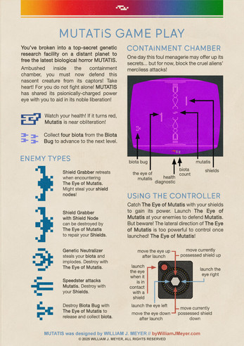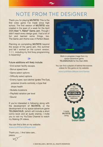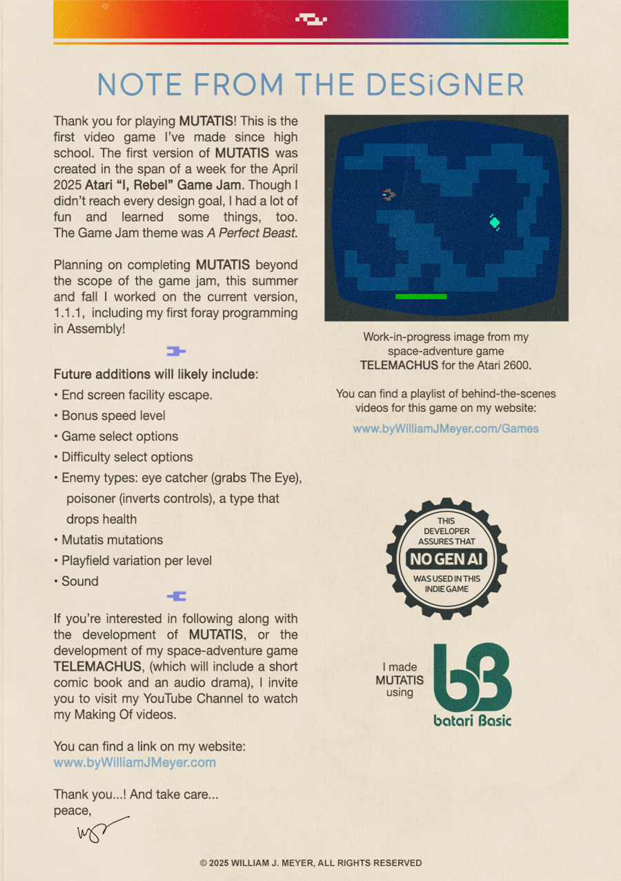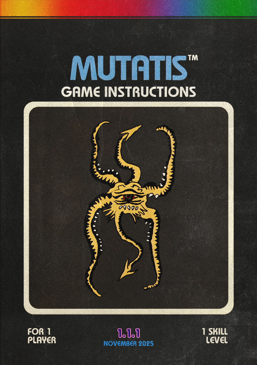 Thank you for playing MUTATIS! This is the first video game I’ve made since high school. The first version of MUTATIS was created in the span of a week for the April 2025 Atari “I, Rebel” Game Jam. Though I didn’t reach every design goal, I had a lot of fun and learned some things, too. The Game Jam theme was A Perfect Beast.